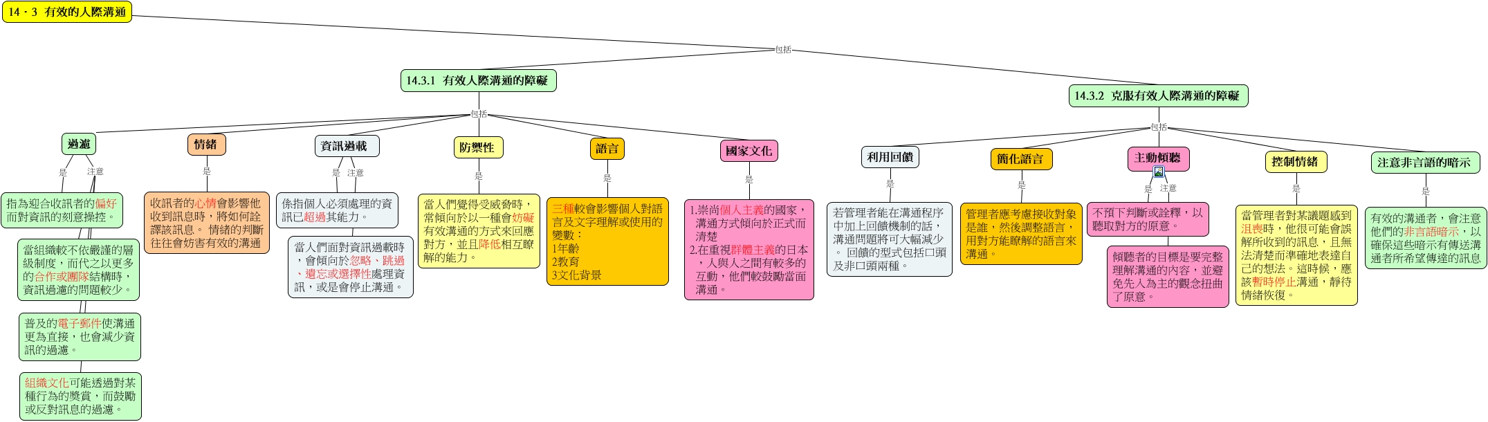此概念图以 IHMC CmapTools 创建, 内含信息有关于: 14.3 有效的人際溝通, 情緒 是 收訊者的心情會影響他 收到訊息時,將如何詮 譯該訊息。 情緒的判斷 往往會妨害有效的溝通, 14.3 有效的人際溝通 包括 14.3.2 克服有效人際溝通的障礙, 14.3.1 有效人際溝通的障礙 包括 情緒, 14.3.2 克服有效人際溝通的障礙 包括 利用回饋, 簡化語言 是 管理者應考慮接收對象 是誰,然後調整語言, 用對方能瞭解的語言來 溝通。, 14.3.1 有效人際溝通的障礙 包括 資訊過載, 利用回饋 是 若管理者能在溝通程序 中加上回饋機制的話, 溝通問題將可大幅減少 。 回饋的型式包括口頭 及非口頭兩種。, 14.3 有效的人際溝通 包括 14.3.1 有效人際溝通的障礙, 14.3.2 克服有效人際溝通的障礙 包括 注意非言語的暗示, 14.3.2 克服有效人際溝通的障礙 包括 簡化語言, 主動傾聽 注意 傾聽者的目標是要完整 理解溝通的內容,並避 免先入為主的觀念扭曲 了原意。, 主動傾聽 是 不預下判斷或詮釋,以 聽取對方的原意。, 防禦性 是 當人們覺得受威脅時, 常傾向於以一種會妨礙 有效溝通的方式來回應 對方,並且降低相互瞭 解的能力。, 14.3.1 有效人際溝通的障礙 包括 過濾, 過濾 注意 當組織較不依嚴謹的層 級制度,而代之以更多 的合作或團隊結構時, 資訊過濾的問題較少。, 14.3.1 有效人際溝通的障礙 包括 國家文化, 14.3.2 克服有效人際溝通的障礙 包括 控制情緒, 資訊過載 注意 當人們面對資訊過載時 ,會傾向於忽略、跳過 、遺忘或選擇性處理資 訊,或是會停止溝通。, 14.3.2 克服有效人際溝通的障礙 包括 主動傾聽, 過濾 注意 普及的電子郵件使溝通 更為直接,也會減少資 訊的過濾。
